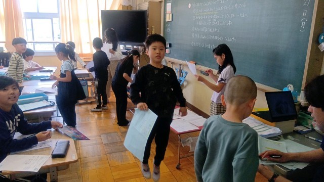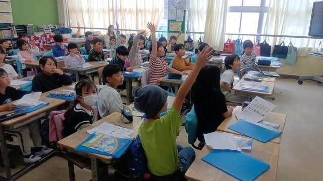 今日は簡単な自己紹介をしていました。私が子どものころは中学校で習ったフレーズを3年生の子どもたちが生き生きと学習しています。すごいものですね。