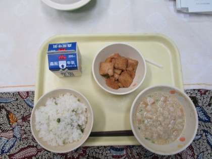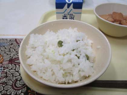 5月7日(金)、今日の給食に「豆ごはん」がありました。この時期、「うすいえんどう」という種類のえんどう豆がスーパーなどにも出始め、「卵よせ」にしたり、「かきあげ」の材料にしたりと食べることが多くなってきます。この「うすいえんどう」はグリーンピースに比べて青臭さが少ないので食べやすいです。今日の豆ごはんも美味しかったです。
