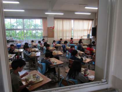 写真下は「もくもく給食」を実践している1年生の様子です。