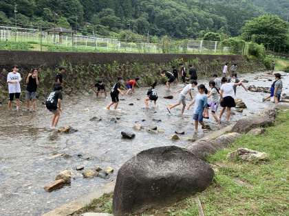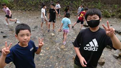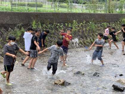 川遊びの1組の子どもたちは班ごとに写真を撮ってもらって川遊びへ。水の掛け合いはだんだんエスカレートします。