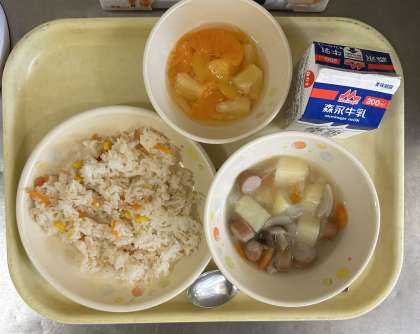 今日の給食は、ツナコーンライス・ポトフ・フルーツカクテル・牛乳でした。