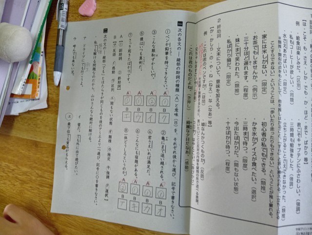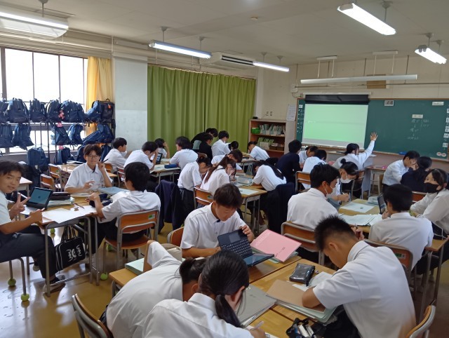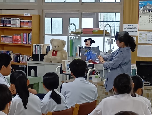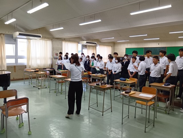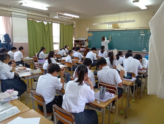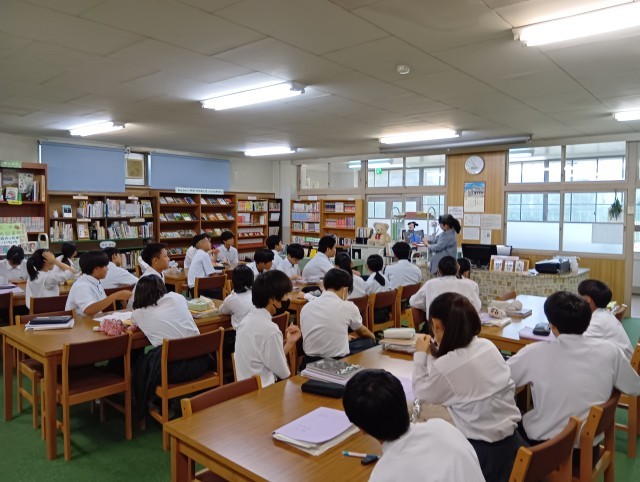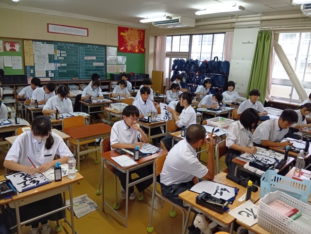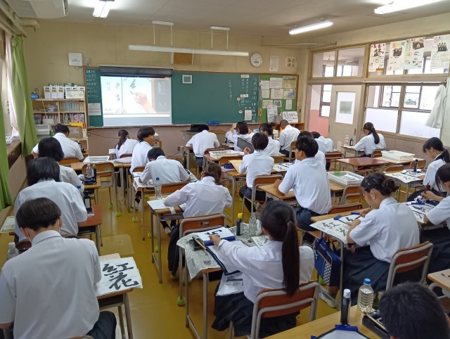 音楽・国語A・国語B・数学の様子です。国語では、司書の先生が読み聞かせをしていました。また行書体の習字もしていました。