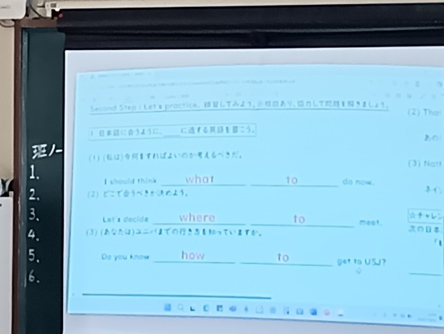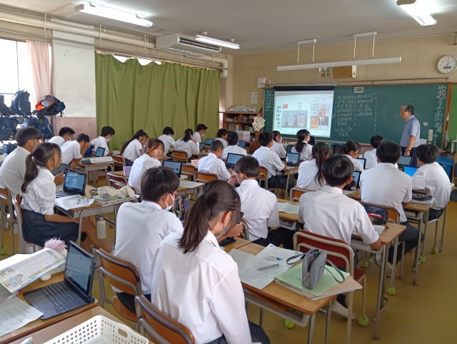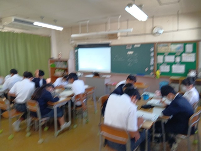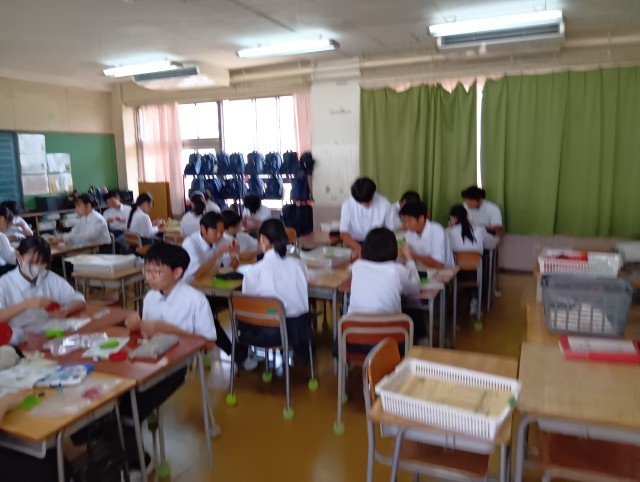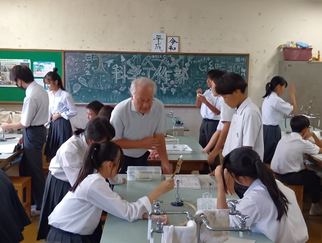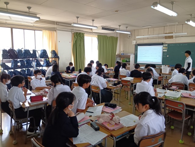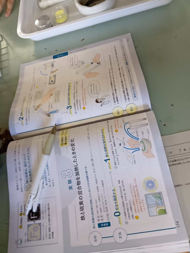 英語B・社会・数学・家庭科・理科です。理科では、鉄と硫黄の混合物の加熱実験をしていました。支援員の先生も入ってくださっています。