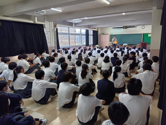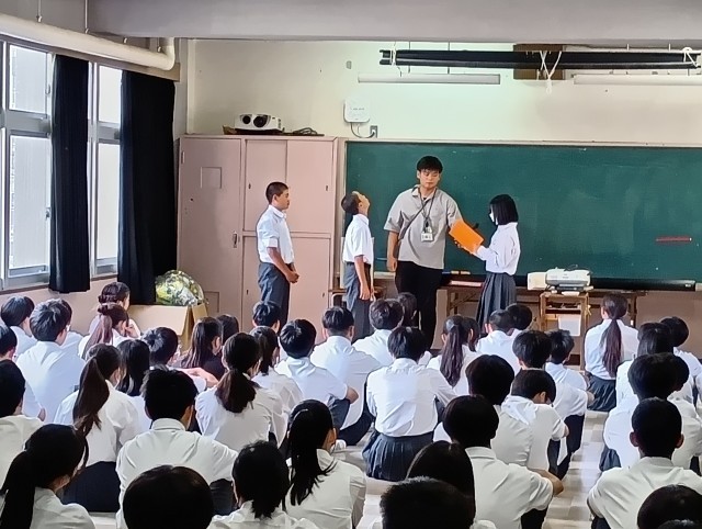 今日の朝、2年生は学年集会をしていました。校風委員企画の表彰、学年主任の先生からの話がありました。