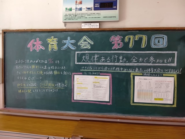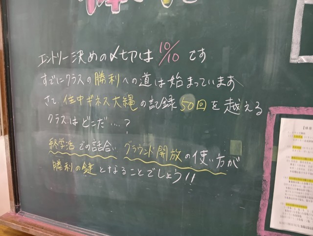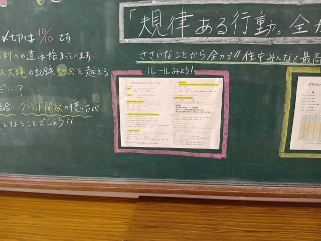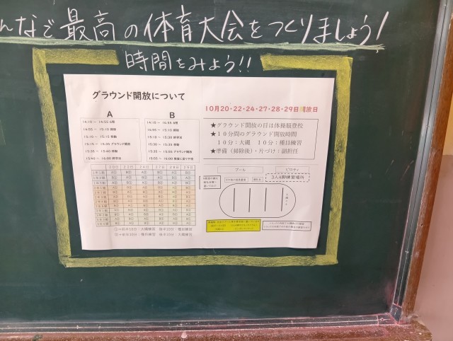 体育大会にむけての掲示です。種目のルールの内容や、グラウンド開放の時程などが掲示されていました。