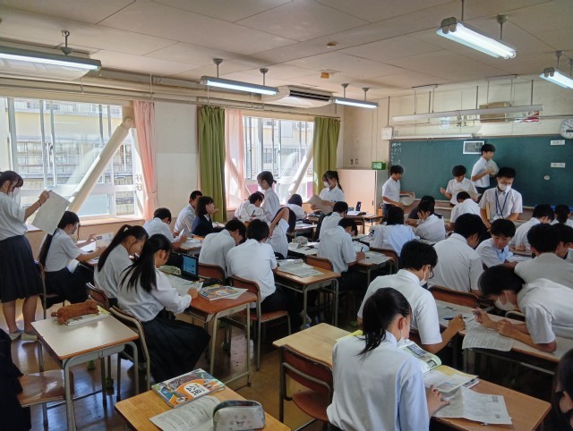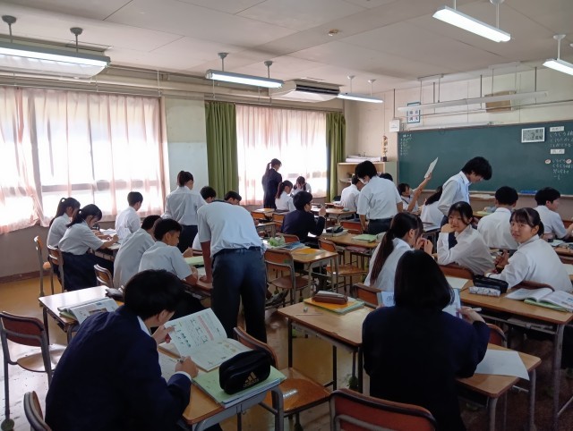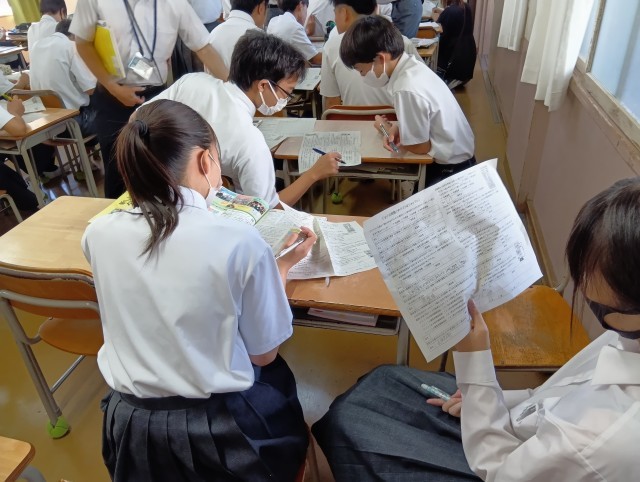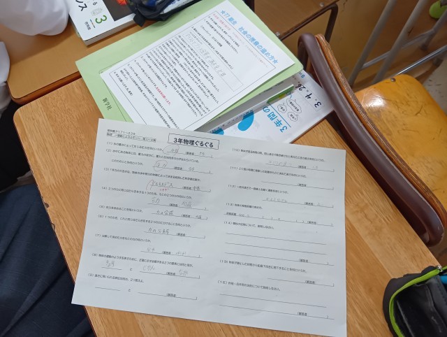 理科・社会・数学・英語です。紙ぐるぐるの手法で問題を確認しあっていました。