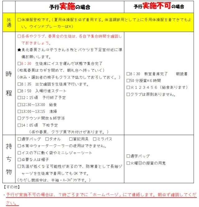 今日の終学活の時間に明日の連絡がありましたが、確認のため掲載しておきます。