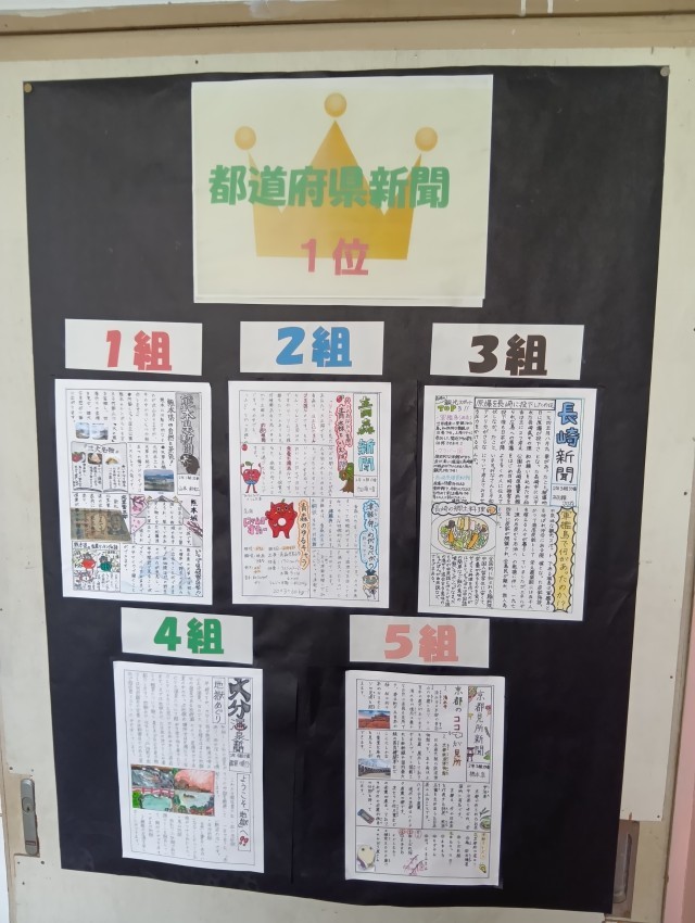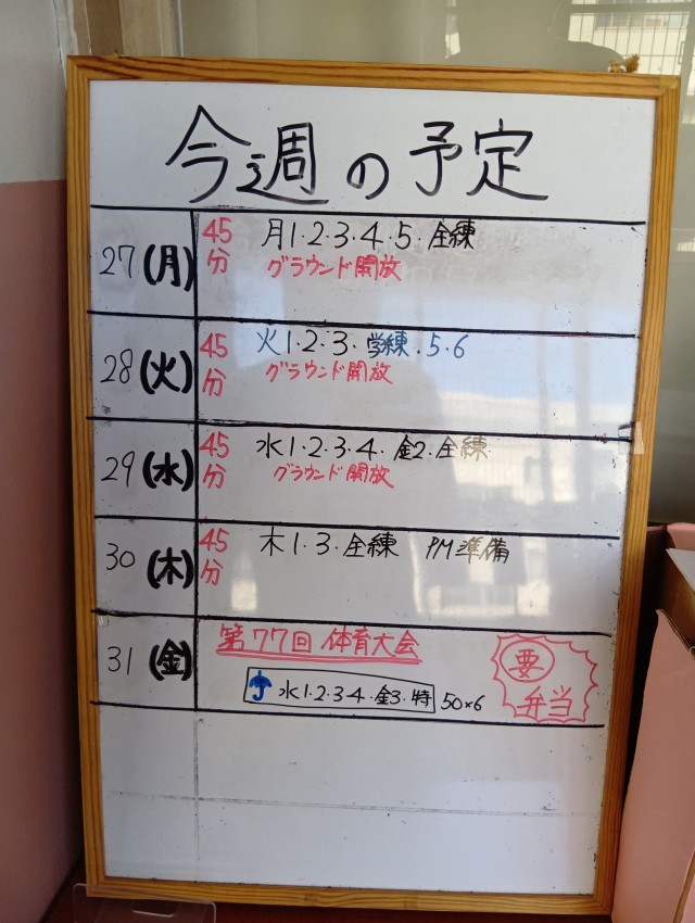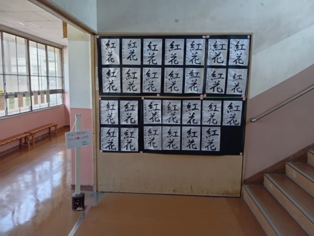 2年生のフロアです。学年主任の先生が、1週間の予定を書いて掲示してくれています。また文化祭の展示投票で1番だった社会の都道府県新聞と国語の授業で書いた習字が掲示されていました。