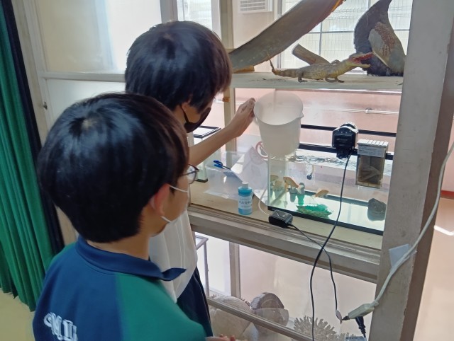 昼休みに科学工作部の部員たちが、金魚の水槽の手入れをしていました。