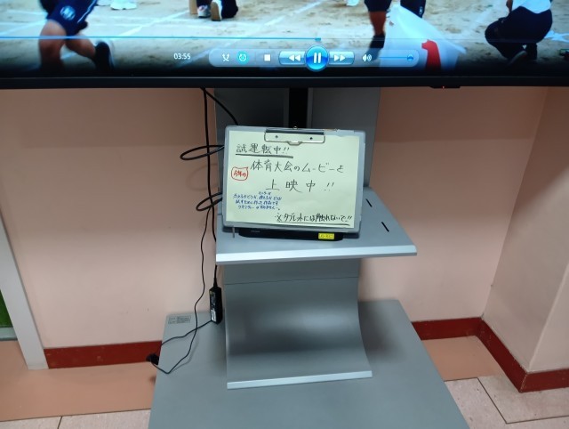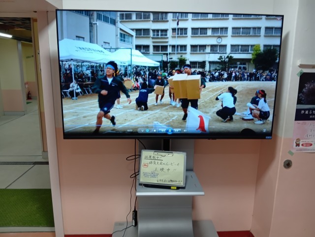 正面玄関に設置されている、テレビモニターに、現在使用できるかの確認も兼ねて、体育大会のショートムービーが上映されています。首席の私が、拙い技術で写真をつなぎ合わせて音楽をつけた動画です。立ち止まって見てくれる生徒もいました。