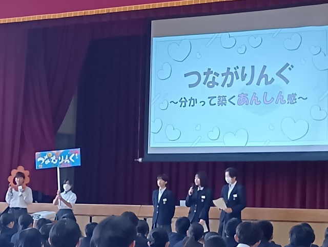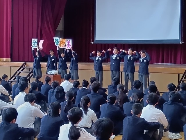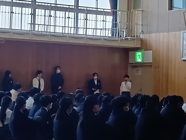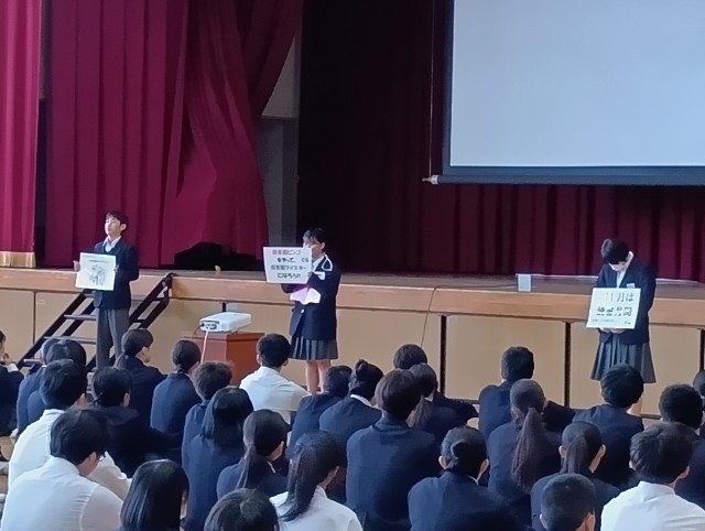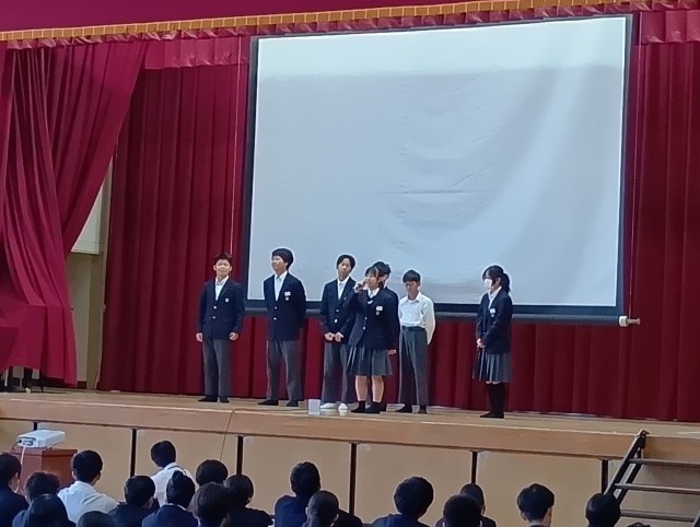 生徒集会がありました。図書委員会・体育委員会・校風委員会・生徒会役員からの発表がありました。