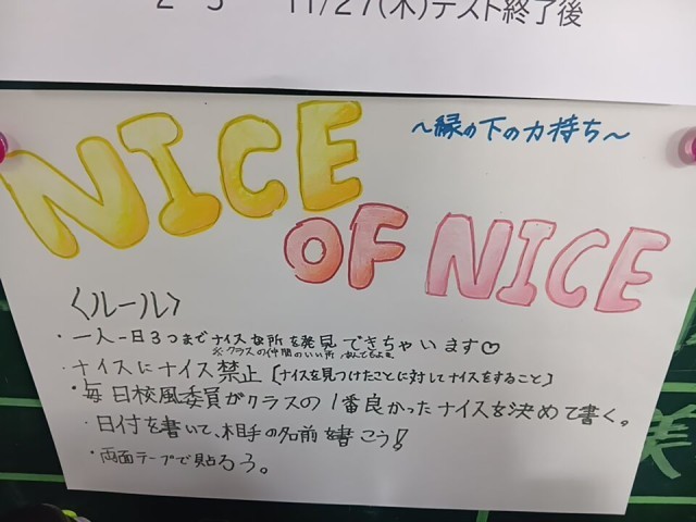校風委員会企画が明日から始まります。仲間のナイスな言動をしっかり見つけあいましょう!
