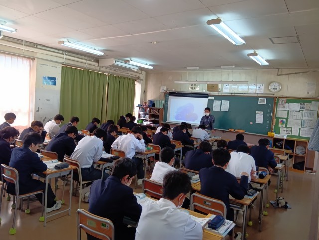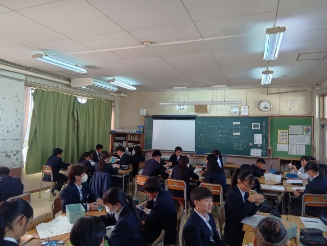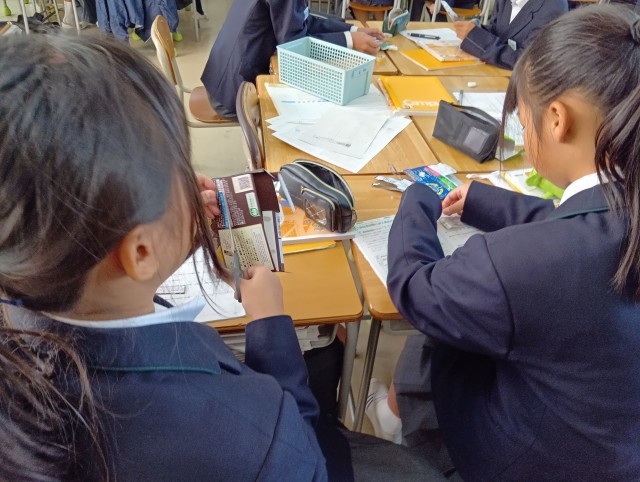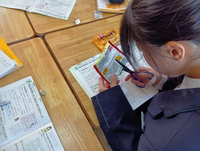 家庭科・体育です。家庭科では、各家庭から持ってきた食品の包装を持ち寄って、加工食品の表示について学習していました。