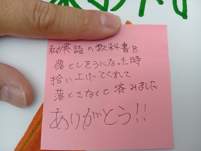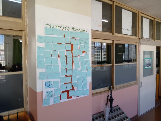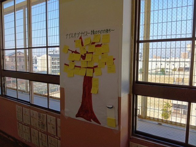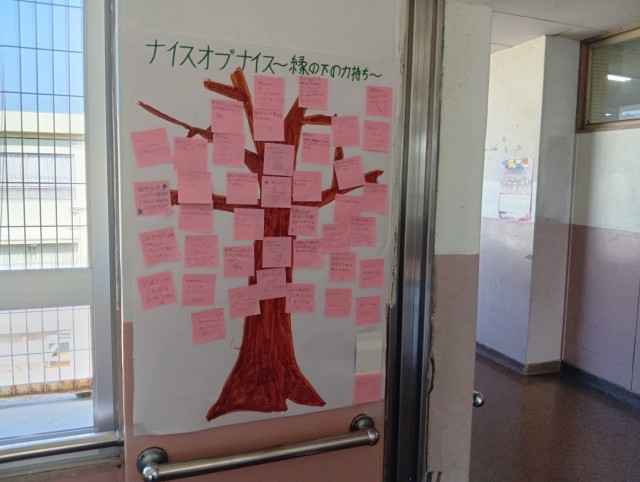 校風委員会企画「ナイスオブナイス」の木です。仲間のナイスな一面を書いて貼る企画ですが、たくさんのふせんが貼られています。ナイスですね★