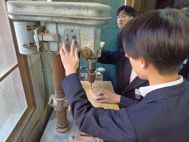 技術・社会・数学・家庭科です。技術では、木工の授業をしていました。慎重に穴をあけていました。