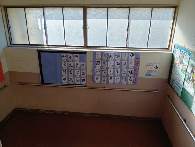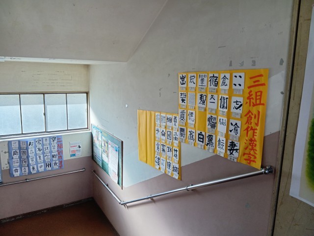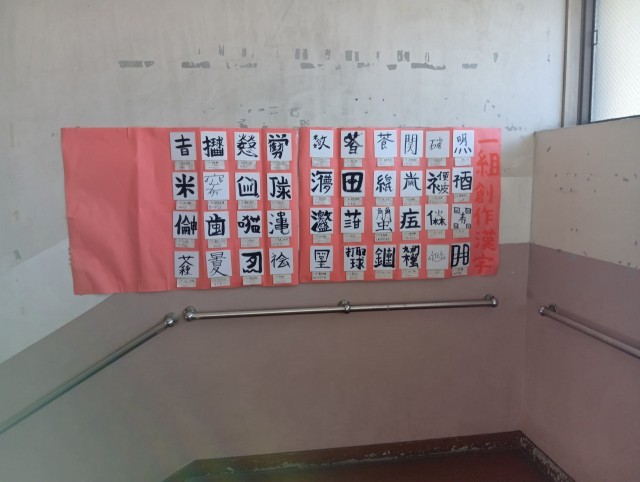 1年生のフロアに上がる階段です。文化祭で展示されていた国語の創作漢字が展示されています。