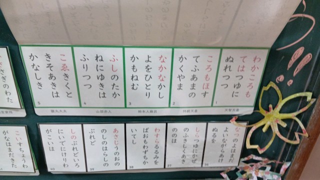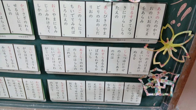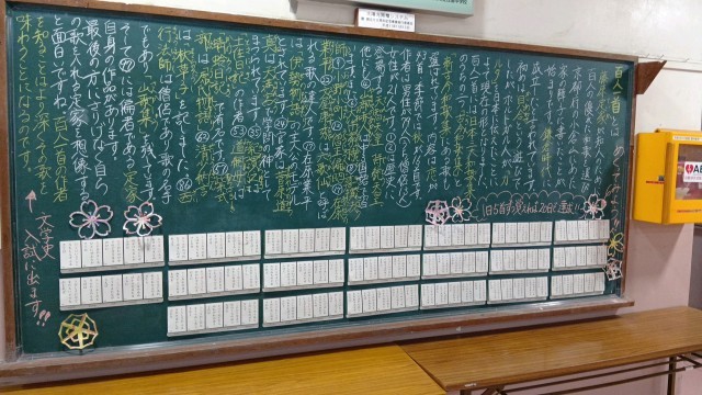 玄関黒板の内容は、国語科で百人一首になっています。百人一首大会が予定されている学年があります。一度めくって確認してみてください。