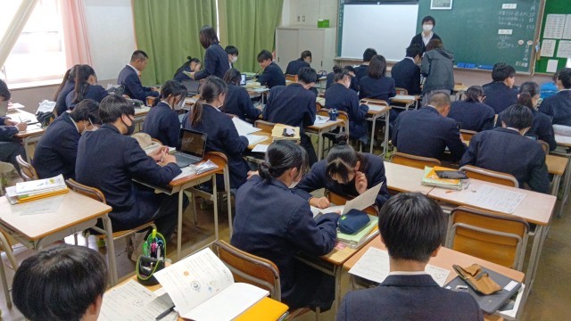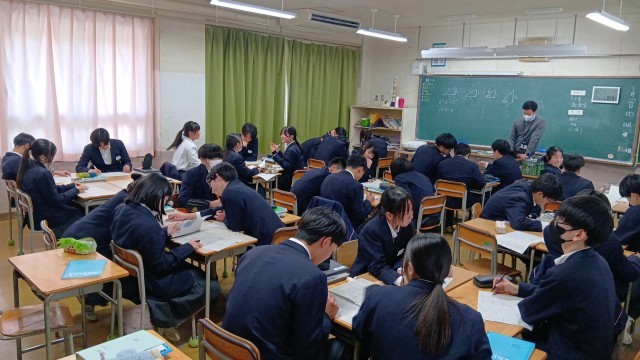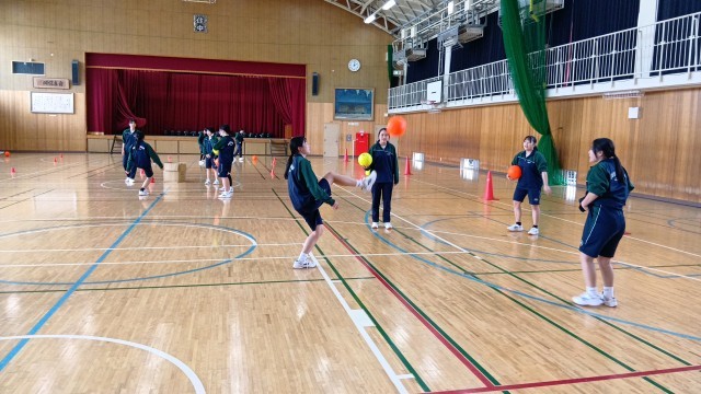 理科・数学・体育です。女子は体育館内でリフティングのテストをしていました。