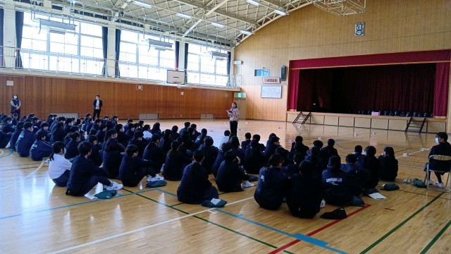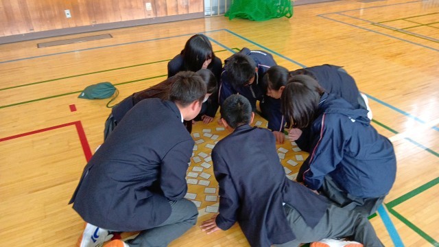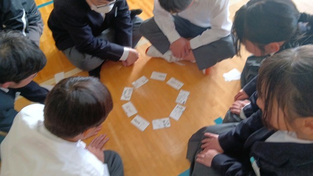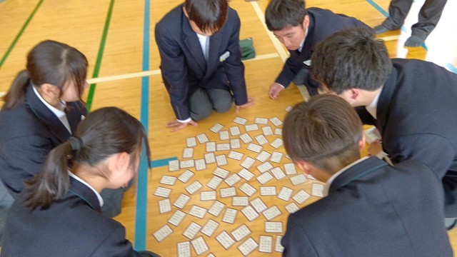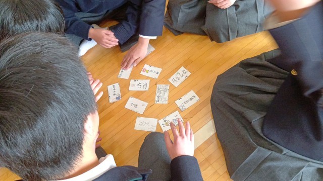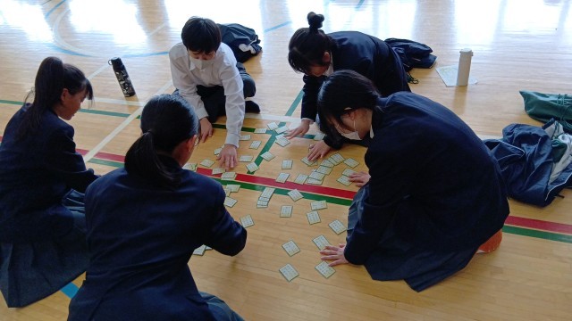 1年生は、午後から体育館で百人一首&故事成語カルタ大会を行いました。