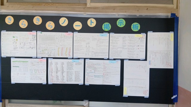 1年生の学年職員室前です。きらきらノートの頑張りが掲示されています。すごく丁寧にまとめられています。