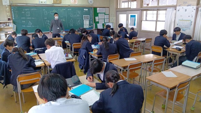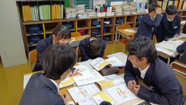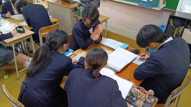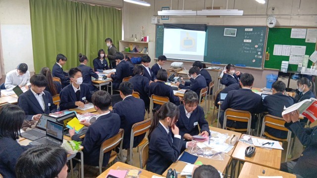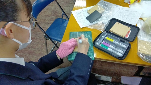 家庭科・技術・社会・数学です。家庭科では、オリジナルネームプレートのデザインをしていました。