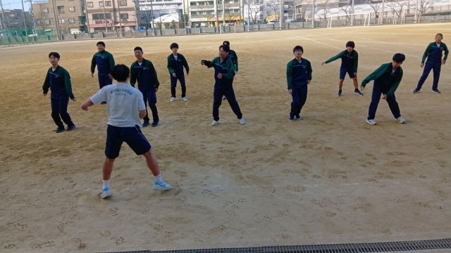 体育の授業です。気温が低い中ですが、元気よく大きな声で準備体操をしていました。