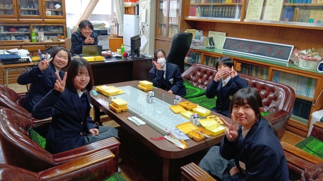 今日の給食時に、生徒会役員と校長先生とのランチミーティングが行われました。和やかな雰囲気で行われています。