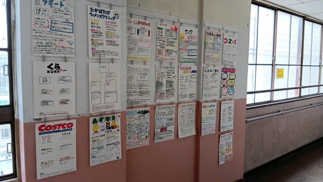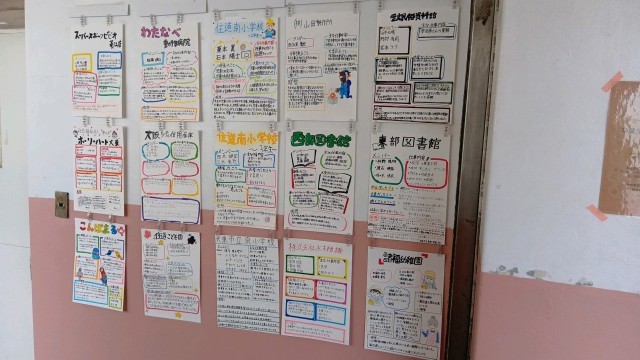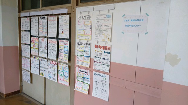 2年生のフロアです。先日行われた職場体験のレポートポスターが掲示されています。