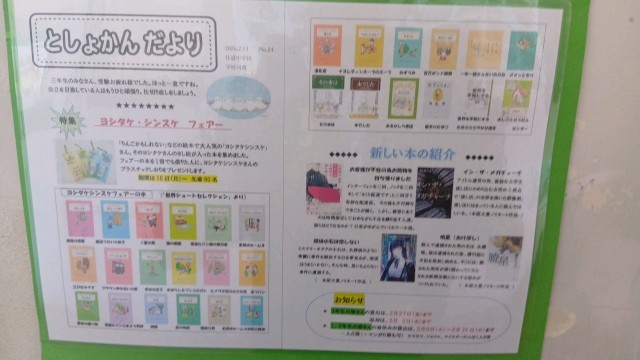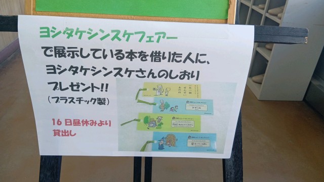 図書室前です。ヨシタケシンスケさんのしおりがもらえる企画が行われています。