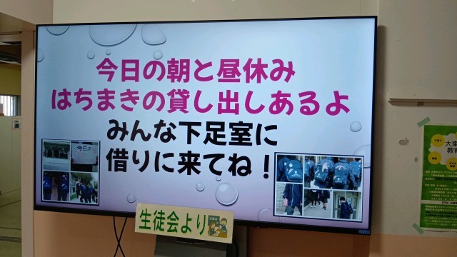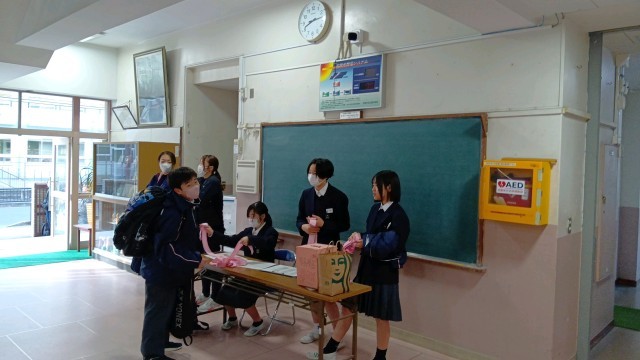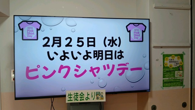 給食の時間に、ピンクシャツデーが始まったきっかけなどをまとめた動画を見ました。