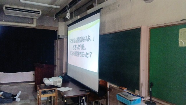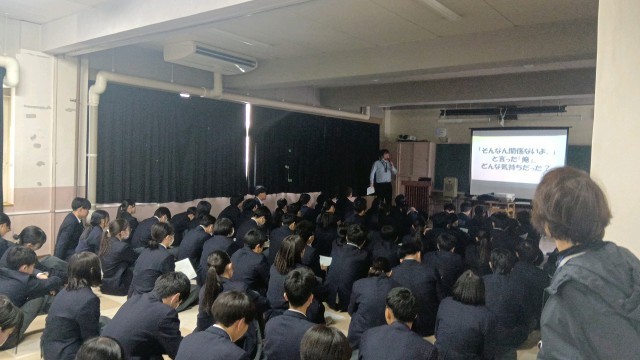 3年生は、多目的室で全体道徳を実施していました。そのあとに、講演会が行われました。