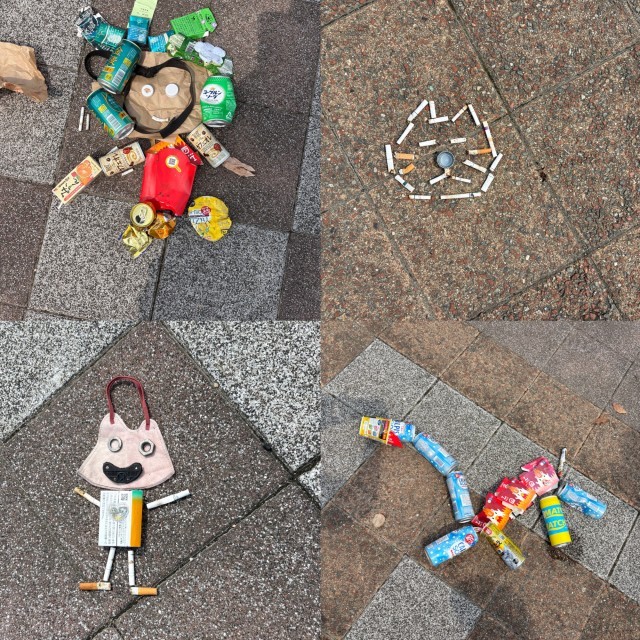 たくさんの方々にゴミ拾いに参加いただき、千本引きも好評でした。また空き缶もたくさん持ってきていただきありがとうございました。ゴミ拾いのあとには、「世界ポイ捨て吸い殻アート協会」さんの協力のもと、ゴミアートを参加者で作成しました。品評会も行いました。