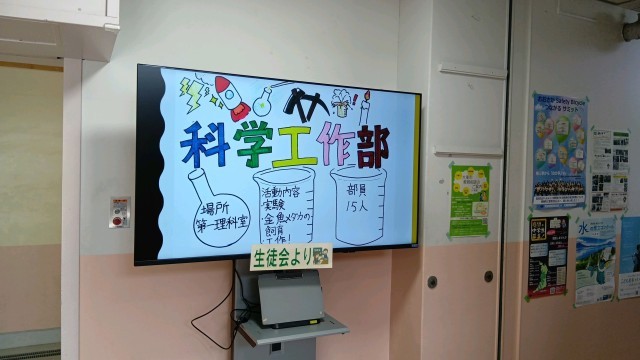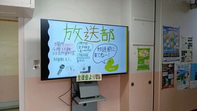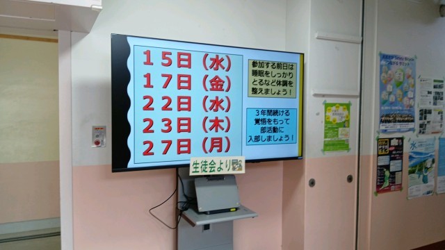 生徒会担当の先生が、玄関モニター用の動画を作成してくださっています。今回は、体験入部もあるのでクラブの紹介ポスターが流されています。