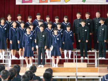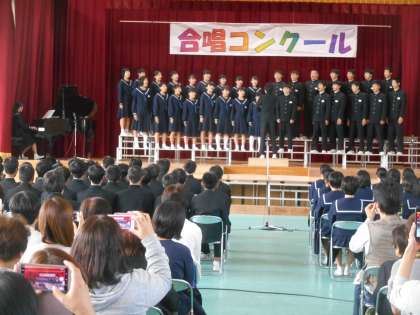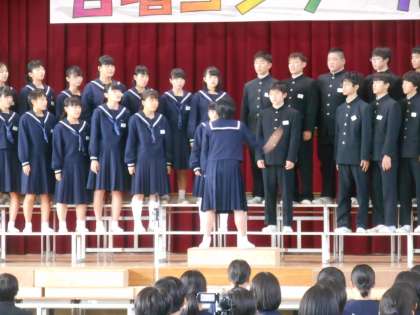 いよいよ3年生の発表が始まりました。やはり、3年生は1年、2年とははっきり違います。体格的にも最高学年という誇りの面でも。すばらしい歌の連続です。鳥肌が全クラス立ちました。すばらしい。
