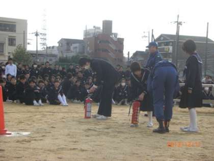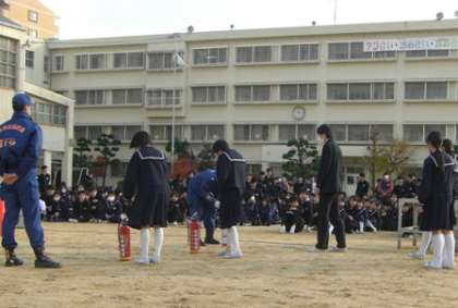 消火活動の実演では、一年では女子二人がみんなの前で頑張ってくれました。