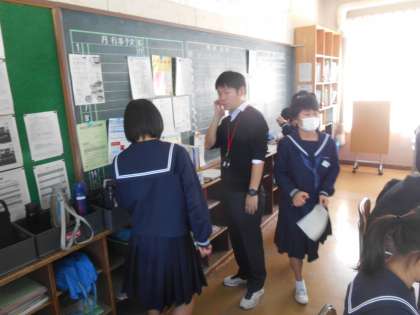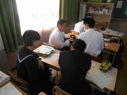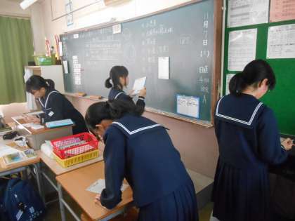 プリントの問題を解き、答え合わせをする生徒、先生に聞く生徒、学び合いをしている生徒たちです。
