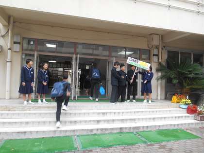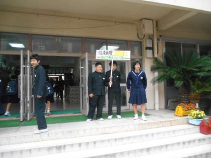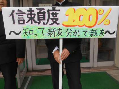 後期生徒会役員の人たちがよりはっきりしてきました。あいさつの声に加え、100%信頼の看板を掲げてメッセージを伝えていました。すばらしい。