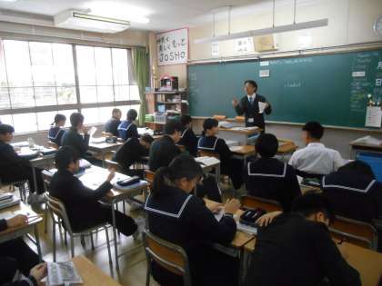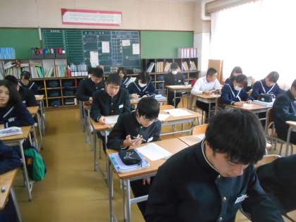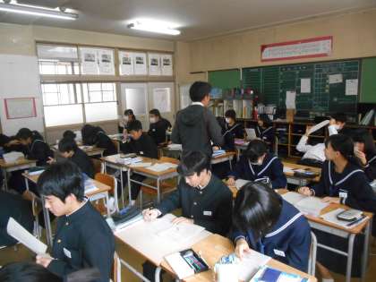 こちらの英語は、英文を覚えるためにまずは自分でもごもご言いながら覚えているところです。この後、グループでの練習となります。