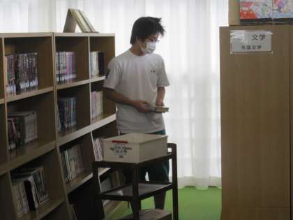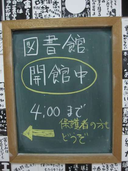 写真は今日の様子で、一枚目は玄関の案内看板。二枚目は本を棚に戻している図書委員の働きぶり。三枚目は図書館でプリントに取り組む人と読書中のクラブ終わりの人たちです。