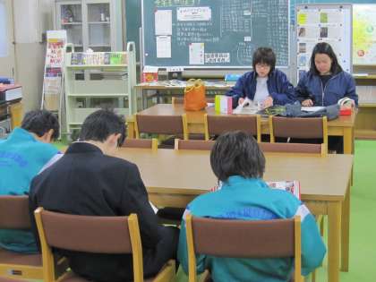 懇談中は4時まで開館しています。待ち時間などにご利用ください。貸出もします。図書館は玄関を入って左の廊下の突き当たりにあります。