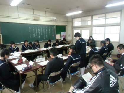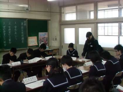 本日の放課後、生徒評議会が行われました。3年委員長会からは、「正直、この時期でもまだ受検(受験)モードに入っていない人もいるので、「お勉強ウォークラリー」について話し合い、校風委員会は、1月の風紀点検について、あいさつ運動について、1月の風紀点検は1月27〜30日(1・2年生)、体育委員会は、各学年であった球技大会の反省、美化委員会は、清掃やゴミに関するアンケート、次回のボランティア清掃について、等々の報告がありました。