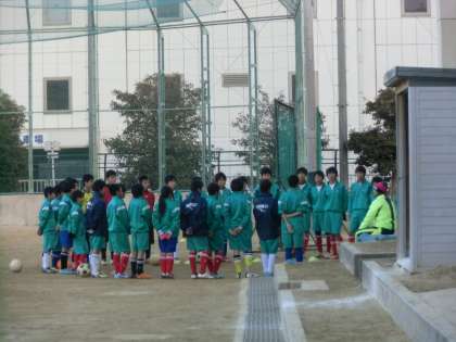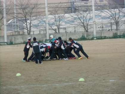 ラグビーのスクラムです。ラグビーは今度の休みに公式戦です。2枚目の写真は、朝のグランドで持久走の練習?をしていた女子二人です。本気で走っていました。3枚目はサッカー部がエンジンを組んでミーティングしているところです。