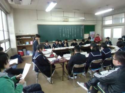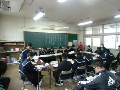 生徒評議会の中で、各委員会からの報告が終わると、次に質疑応答がありました。サッと手が挙がり、「1年生の百人一首の目的や反省はどんなものが出たんですか。」それに対して1年生委員会から「目的は、日本文化に親しむということです。反省点は、百人一首をやっているときは、楽しめたんですが、あとの表彰がだらけたんです。」なるほど、しっかり答えて答えていました。何も見ず、「日本の文化に親しむことです。」と言ったときには「おーっ、やるなあ。すばらしい。」と思いました。次には、「2年委員会の人に聞きます。一人の人に声をかける、と、さっき言いましたけど、それはどういうことですか。」「それは、ひとりぼっちの人をなくすということで、移動教室(音楽室や体育館)に行くときに、一人で教室にいれば、声をかけていっしょに行こう、と誘います。」との回答でした。なるほど。次に、「美化委員さんに聞きます。12月にあったボランティア清掃がありましたが、多くの人が来すぎてたいへんだったと思いますが、今度はどうしますか。」「それについては、一か所の清掃ではなく、校舎回り、グランドなどいくつかの場所を考えたいと思います。」との回答。さすがの回答ですね。次に、生徒会長が「朝礼や生徒集会のときに、体育館で8時30分には始まるのに、最近集まるのが遅いと思います。なんとかしたいと思います。」と全員に問いかけると、3年生委員会から「あのー、3年生は8時30分に教室に来る人が多くて、その時間に体育館というのは…。」と正直な回答。よくないことかもしれませんが、こういう生の話が生徒の中で出ることで、自分たちで何とかしないとと思う気持ちが出ると思います。ちなみに、各学年の先生が朝礼などの日には教室を回って、「今朝は朝礼(生徒集会)です。早く体育館に行くように。」と大声で回っています。