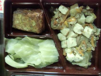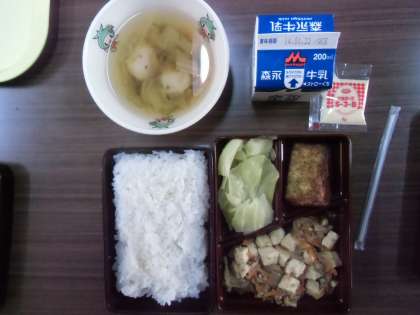 今日の給食は、豆腐のカレー煮、千草あげ、ボイルキャベツ、五目汁、マヨネーズでした。