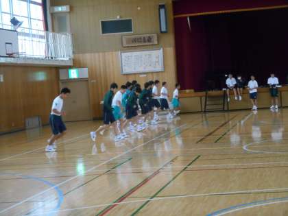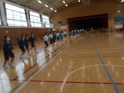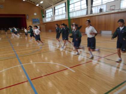 体育館でシャトルランをしていました。スタート直後の様子です。まだ、元気です。