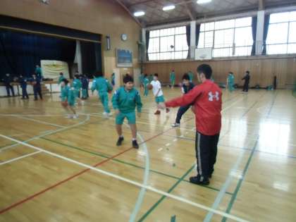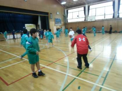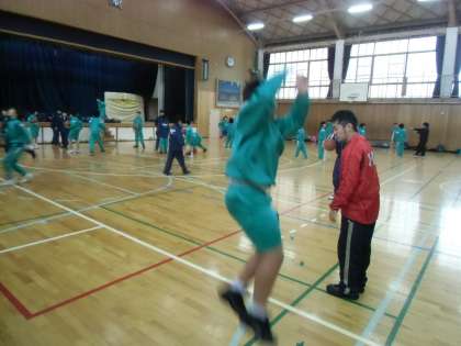 男子バスケ。廣瀬先生が、ジャンプシュートはこうするんだ、と懇切ていねいに指導しているところです。