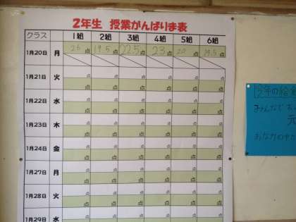 昨日より委員長会の授業態度向上の取り組みが始まっています。毎時間の授業態度を教科の先生に5点満点で採点してもらい、二週間の合計点数を一覧表に記入していきます。初日は1組が一番でした。どのクラスもこの取り組みをきっかけにして、自分のため、そしてクラスの仲間のためにも授業・勉強がんばりましょう!