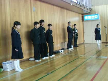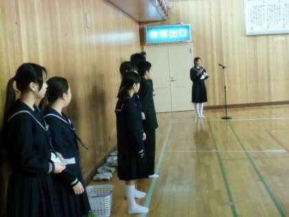 朝の生徒集会の様子です。生徒集会は、朝礼と違って、生徒会役員が進行し、基本的に内容も生徒会が決めます。