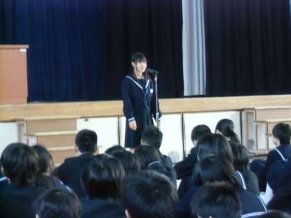この写真は、生徒会役員が、先日の生徒評議会で、「生徒会の役員は、この住中をどうしていきたいのですか。」と質問されたことを受けて、全校生徒の前で、「私たちは、この学校を『おもいやり』の気持ちがあふれる学校にしたいです。」と答えたときの写真です。すばらしい。