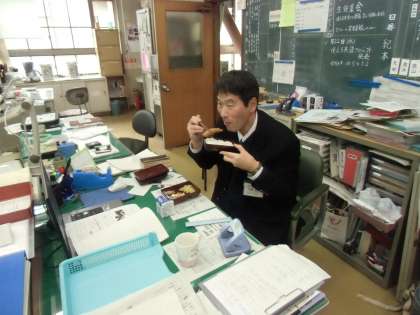今日の給食は、太刀魚フライ、キャベツソテー、小松菜のチャンプル、シーチキンのそぼろ煮でした。3枚目は試食している教頭です。